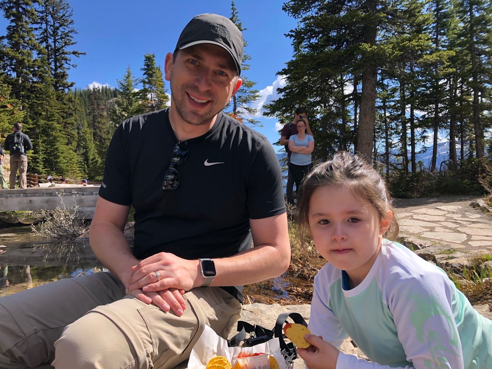 About five minutes from the top J decided that she didn't want to walk anymore... she was done! So I took the backpack with M in it, which at this point seemed like it weighed 100 pounds, and Jon carried her the rest of the way. At the top (which ended with two sets of stairs) we made a beeline for the bathroom and then found a nice spot on the rocks next to Lake Agnes. We got some lovely fluffy biscuits with homemade jam, tortilla chips, and different flavored teas. It was an idyllic spot to enjoy this freshly made fare and we stayed for a good hour before deciding to return down. We promised J it would be much faster on the way down (it was) and that ice cream was waiting for her (which we found).