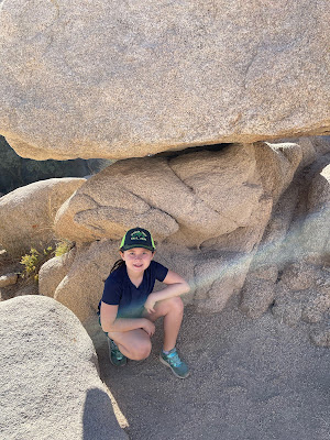 Since we had been to LA so many times, we wanted to check out somewhere new that we hadn't been to before. Joshua Tree is only about two hours away from Dan's house (when you leave at the right time!). We left in the morning and went straight to the Joshua tree visitor center to get a map and some hats for the kids. It was already pretty hot outside. From there we went to our first hike called the Hidden Valley Nature Trail Loop. This is a one mile loop that circles a small valley surrounded by large boulders. There were signs along the way explaining the different plants and animals. We even saw a group of people scaling the large rocks! This was our favorite hike due to its kid friendliness and scenery!